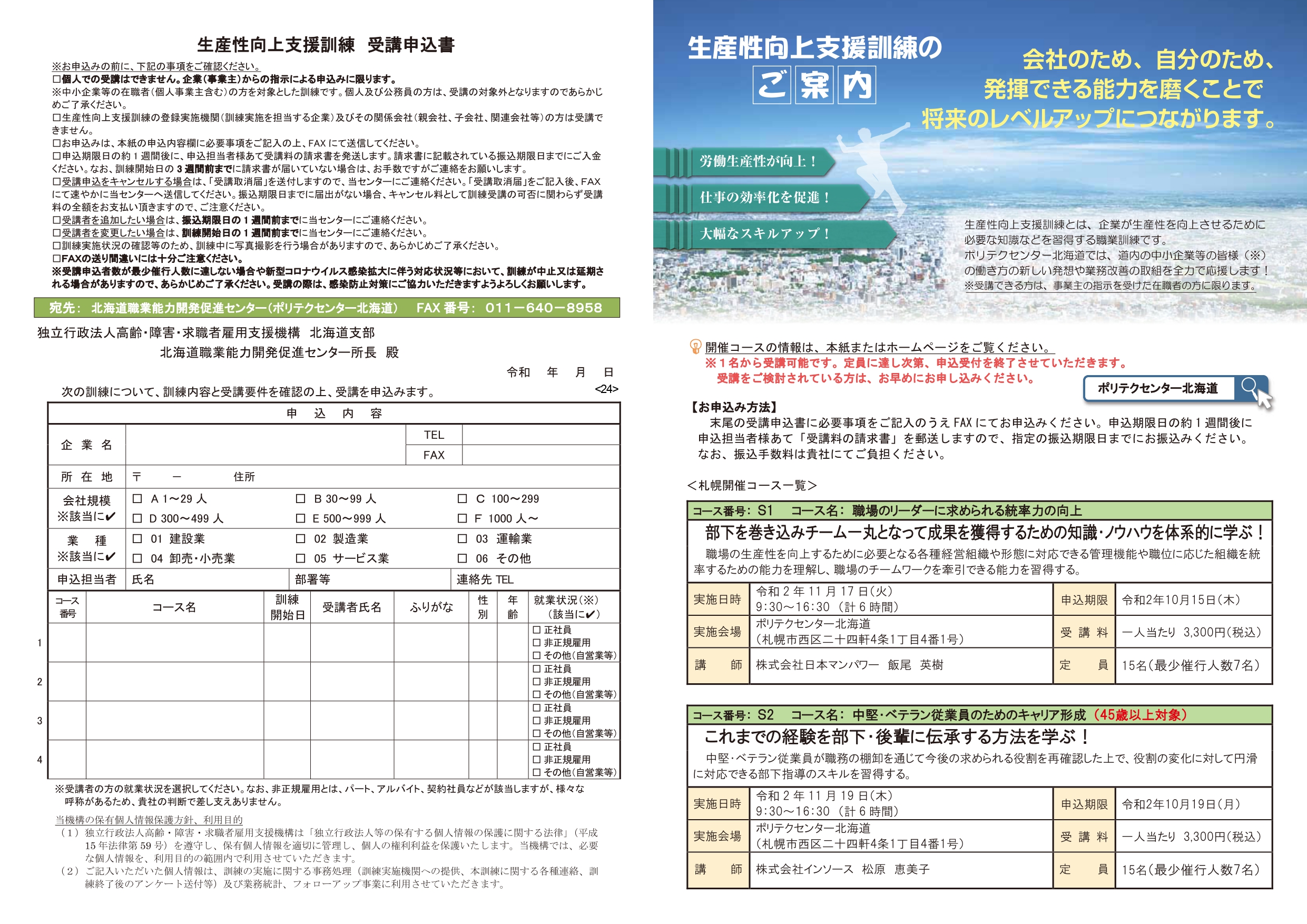 ポリテクセンター北海道より「生産性向上支援訓練」のご案内です。