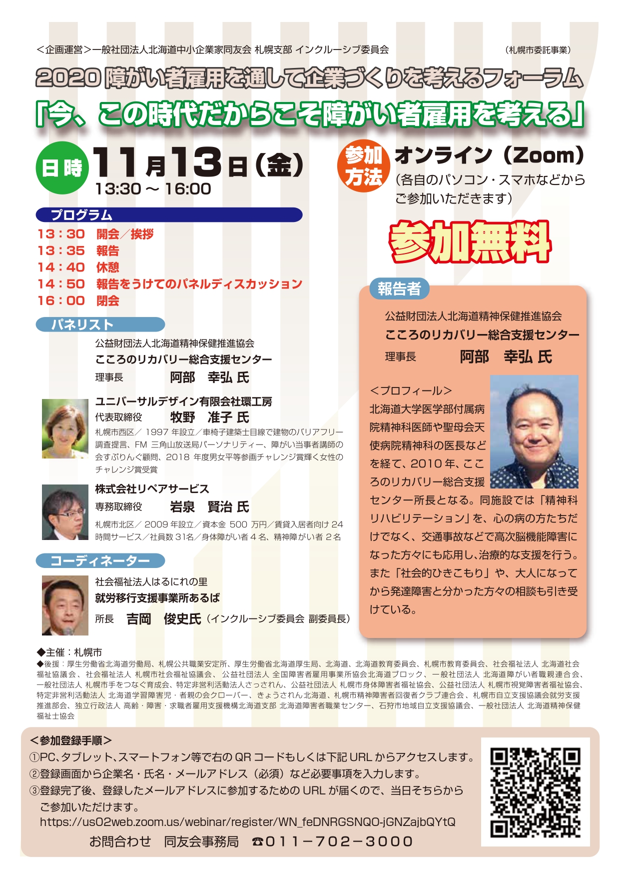 報告者には、公益財団法人北海道精神保健推進協会 こころのリカバリー総合支援センターの阿部 幸弘理事長をお招きしての報告会を行った後、パネルディスカッションを行います。