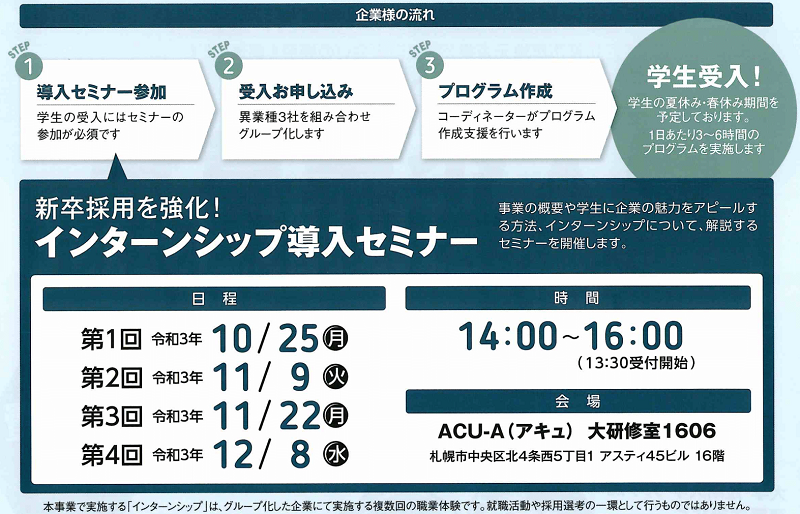 インターンシップに興味があるさっぽろ圏(※)の地元企業と、さっぽろ圏での就職を希望する学生が出会うための事業です。