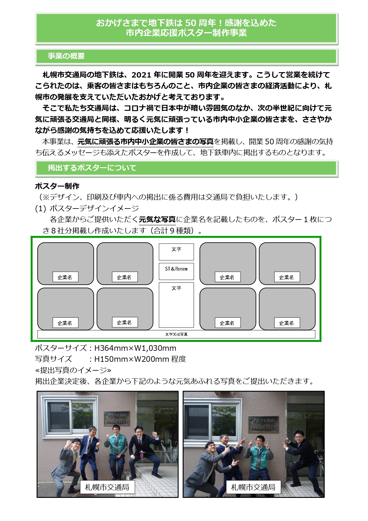 本事業は、元気に頑張る市内中小企業の皆さまの写真を掲載し、開業50周年の感謝の気持ち伝えるメッセージも添えたポスターを作成して、地下鉄車内に掲出するものとなります。