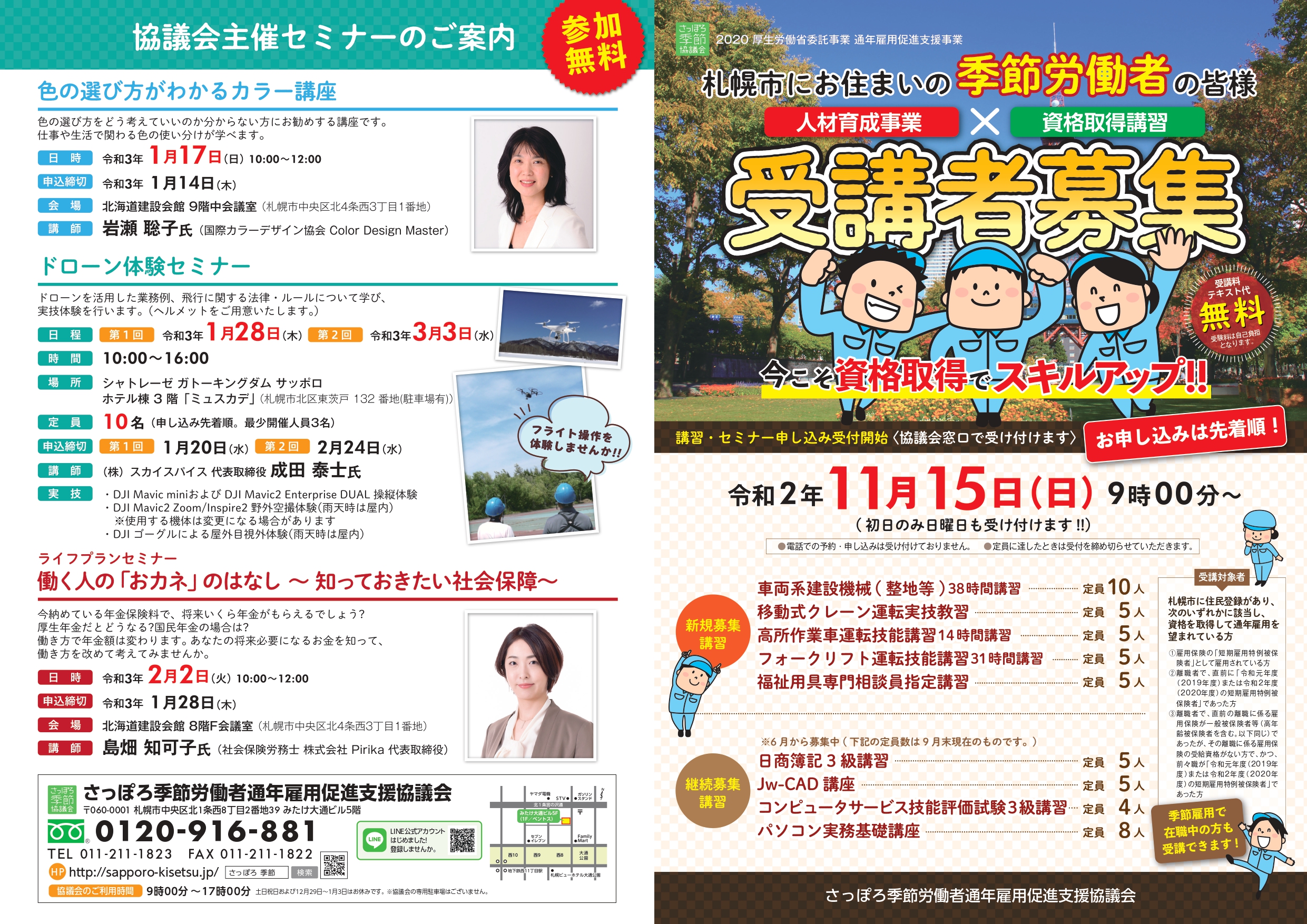 さっぽろ季節労働者通年雇用促進支援協議会から、札幌市内にお住いの季節労働者の方に、資格取得無料講習及び協議会主催のセミナーのご案内です。