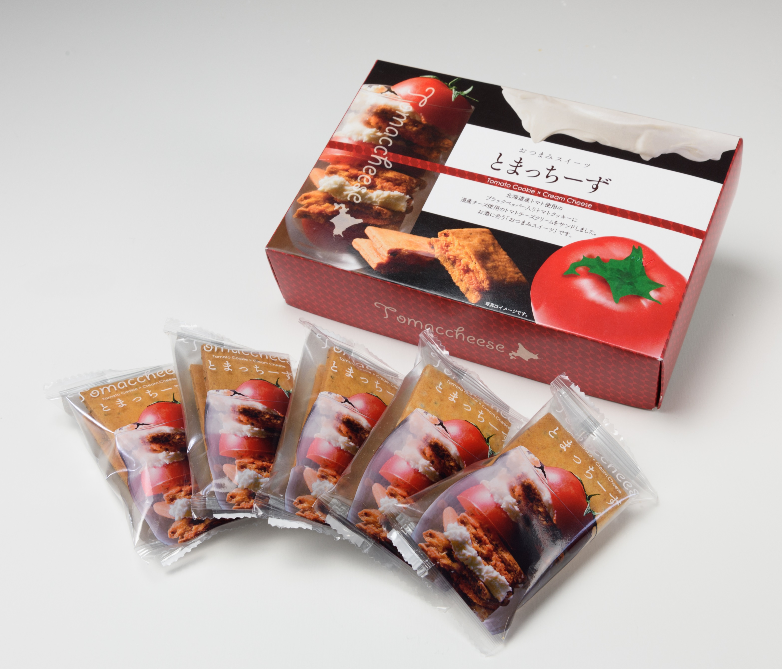 チーズのせクラッカーから着想し、トマト粉末を練り込んだクリームチーズを、道産のトマトピューレが入ったクッキーで挟んでいます。クリームチーズとの相性を考え、クッキーの硬さや食感、厚さを調整し、約5ヵ月の試作を重ねて開発しました。トマトの酸味やチーズのコクを損なわずに、隠し味にブラックペッパーを効かせてビールやワインに合う味わいに仕上げています。価格は3個入りで税込み486円。